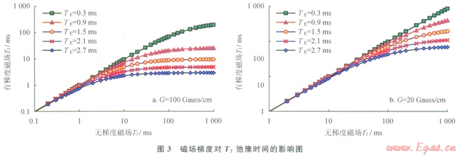 對比模擬的兩種大小的內(nèi)部梯度磁場對T2譜影響的成果圖可看出(圖3):相同回波間隔下,內(nèi)部磁場梯度越強(qiáng),相同弛豫組分對應(yīng)的T2譜時(shí)間越短,意味著T2譜前移越明顯,使其向弛豫時(shí)間變短的方向移動。