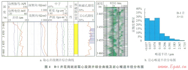 從孔喉大小看,圖5所示的基性玄武巖的孔喉半徑(圖5-b)要明顯的大于酸性花崗斑巖(圖4-b)?;孕鋷r孔喉半徑大于0.148mm的孔喉體積要明顯的大于酸性花崗斑巖,孔喉半徑大于0.148mm的孔喉體積兩口井分別是48%和l8.2%,孔喉半徑大小差異明顯。