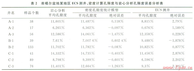 密度測井反映的是儀器探測范圍內(nèi)地層的總密度,能有效反映地層的總孔隙度,對各種類型的孔隙度都能有效反映,如火成巖地層中大的氣孔、溶蝕孔洞空隙都能反映。采用巖心刻度測井的方法,分區(qū)塊、分巖性建立了不同區(qū)塊、不同巖性的密度測井與巖心分析孔隙度間的線性回歸模型用于計(jì)算火成巖儲層的孔隙度,實(shí)際應(yīng)用表明,利用密度曲線計(jì)算的孔隙度與巖心分析孔隙度之間的誤差較小(表2)。