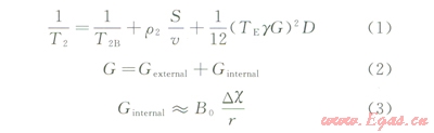 式中T2B為體積弛豫,ms;D為擴(kuò)散系數(shù),cm2/s;G為觀測時(shí)的梯度磁場;g為旋磁比;TE為回波間隔;r2為橫向表面弛豫強(qiáng)度;S/V為巖石比表面;B0為外加磁場強(qiáng)度;r為磁場變化的距離;Dc為巖石骨架顆粒與孔隙流體之間磁化率的差。
