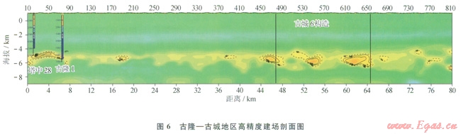 經(jīng)驗表明,碳酸鹽儲層具明顯的非均質(zhì)性,寬線攻關(guān)的地震資料很好地解決了地層橫向展布問題,但不能解決儲層預(yù)測問題,只有三維地震資料才能滿足縫洞雕刻、儲層預(yù)測的需求。在無工業(yè)油氣流井的情況下,能否部署三維地震,在哪兒部署三維地震又是勘探工作者面臨的新問題。經(jīng)過多方研究和論證,嘗試使用非地震高精度建場技術(shù)。2008年,在古城6構(gòu)造上部署了高精度建場388km/8條非地震,高精度建場資料在下奧陶統(tǒng)一寒武系頂面附近顯示出烴類呈層狀分布的特征,具有局部富集的特點(圖6),其中古城6構(gòu)造烴類顯示最為有利?;诙S寬線和非地震資料綜合研究成果進一步明確三維地震的部署靶區(qū)。