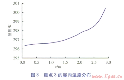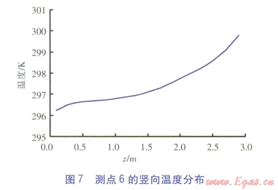 測點6、3、1¢的豎向溫度分布分別見圖7~9。由圖7~9可知,3個測點的溫度沿高度方向(三軸方向)逐漸增大。對于測點6、3,在0.1~1.2m高度范圍內(nèi)溫度緩慢升高,當高于1.2m后溫升速度較快。對于測點l¢,在0.1~2.0m高度范圍內(nèi)溫度緩慢升高,在0.2~1.5m高度范圍內(nèi)溫度出現(xiàn)波動,這一高度區(qū)域恰好與坐姿下的人體腳踝到高于頭頂30cm一段吻合。當高于2.0m后,溫升速度較快。
