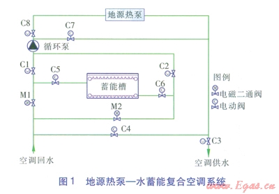 近年來,隨著霍辯的不斷發(fā)展和人們對低碳環(huán)保的重視,地源熱泵憑借獨特的優(yōu)勢得到越來越廣泛的應用。如今地源熱泵的研究已經(jīng)比較成熟,但其仍面臨著取能蓄能難以平衡,不能有效利用電力峰谷差價的問題[1]。水蓄能裝置可以有效利用電力的峰谷差價,但其應用具有一定的局限性[2]。基于以上考慮,將地源熱泵和水蓄能技術相結(jié)合,形成地源熱泵一水蓄能復合空調(diào)系統(tǒng),本文對該系統(tǒng)進行研究。