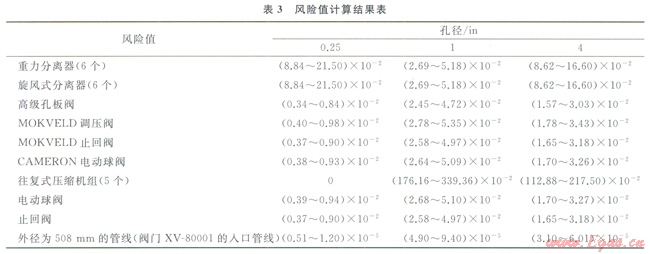 設(shè)備或管線的風(fēng)險值為失效后果和失效概率的乘積(表3),設(shè)備風(fēng)險要比管線風(fēng)險大得多,而其中5套壓縮機組不論是失效后果還是失效概率都是最大的,其次是重力分離器和旋風(fēng)式分離器,以上所得風(fēng)險數(shù)值為相對比較數(shù)值,不同站、同站不同區(qū)域之間沒有可比性。