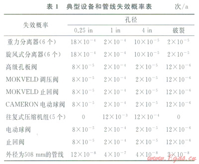 根據(jù)API 581標(biāo)準(zhǔn)以及榆林站1999—2012年的失效統(tǒng)計數(shù)據(jù)[22],考慮管理修正系數(shù),一線榆林壓氣站內(nèi)管線和典型沒備失效概率確定結(jié)果如表1所示。