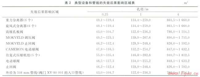 分別按設(shè)備破壞面積和人員的致死事故面積計算失效后果,由于設(shè)備和管線完全破裂的可能性很小,末計算破裂的失效后果,主要設(shè)備失效后果影響區(qū)域見表2。