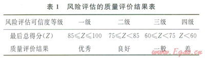 依據(jù)對評價結(jié)果的量化程度,將風(fēng)險評估質(zhì)量評價方法大致分成定性和定量兩大類。定性方法主要有專家評分法、風(fēng)險矩陣法、檢查表法和影響圖法等;定量方法主要有風(fēng)險函數(shù)法、關(guān)聯(lián)度函數(shù)法和指標(biāo)體系等。由于指標(biāo)體系法其評價方法簡單、易于操作,故筆者采用指標(biāo)體系法來進行質(zhì)量評價。