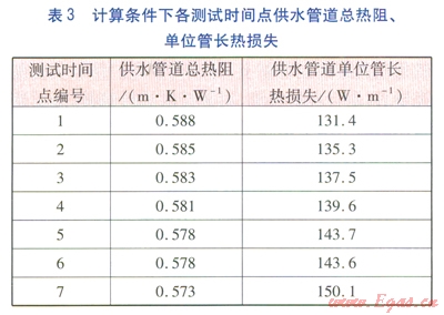 計算條件(指保溫層、保護層材料熱導率均取計算值時)下各測試時間點供回水管道總熱阻、單位管長熱損失分別見表3、4。