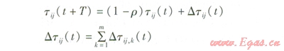 需要注意的是,在每只螞蟻走完一步或者完成對所有n個節(jié)點的遍歷后,要對殘留信息進(jìn)行更新處理,否則過多的殘留信息會淹沒啟發(fā)信息。因此,在螞蟻經(jīng)過一個節(jié)點或經(jīng)過所有節(jié)點完成一個循環(huán)所需的時間T后,即t+T時刻在節(jié)點i與j路徑上的殘留信息量tij(t+T)可按以下規(guī)則進(jìn)行調(diào)整: