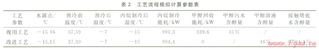 現(xiàn)用注醇工藝流程模擬與改進后注醇工藝流程模擬原料氣的溫度、壓力、流量以及原料氣組成完全相同,而且保持板翅換熱器與丙烷蒸發(fā)器的溫降也相同。與此同時,現(xiàn)用注醇工藝與改進后注醇工藝外輸干氣的露點分別為-l5.16℃和-15.15℃,幾乎相同,在保證沒有天然氣水合物形成、取最小注醇量的基礎(chǔ)上對兩種工藝進行對比分析,工藝參數(shù)對比見表2。