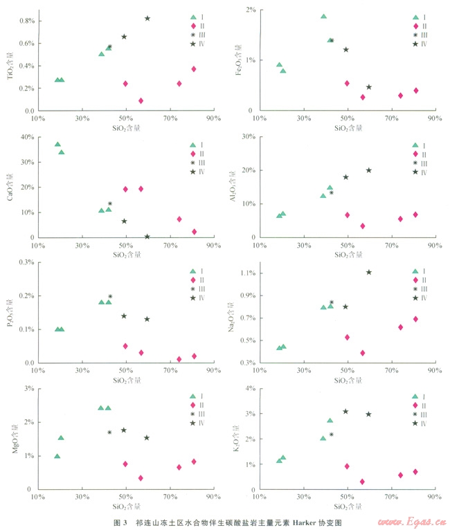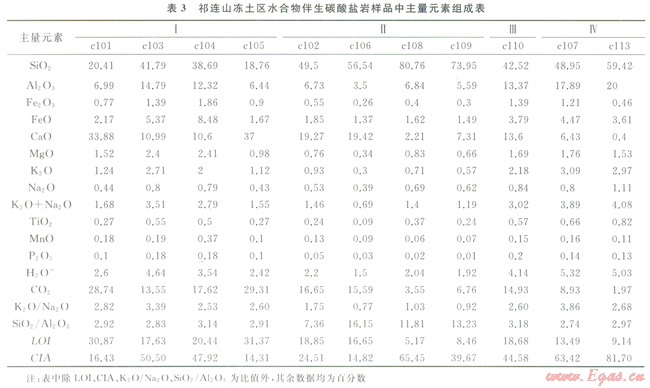 近幾年,在祁連山凍土區(qū)水合物科學試驗鉆探過程中,觀察到大量與水合物伴生的碳酸鹽礦物,這些伴生碳酸鹽礦物(或部分)是否與水合物存在著某種成因上的聯(lián)系,還不得而知。由于碳酸鹽礦物?;煊兴樾汲练e且難以與碎屑沉積分選開來,筆者以祁連山凍土區(qū)新近發(fā)現(xiàn)的與水合物伴生碳酸鹽礦物及其混雜的碎屑沉積(統(tǒng)稱碳酸鹽巖)為研究對象,從分析伴生碳酸鹽礦物所在沉積巖中主量元素、微量元素、稀土元素等特征入手,探討伴生碳酸鹽礦物可能物質(zhì)來源與沉積條件,試圖揭示不同產(chǎn)狀伴生碳酸鹽巖同水合物的內(nèi)在成因聯(lián)系。