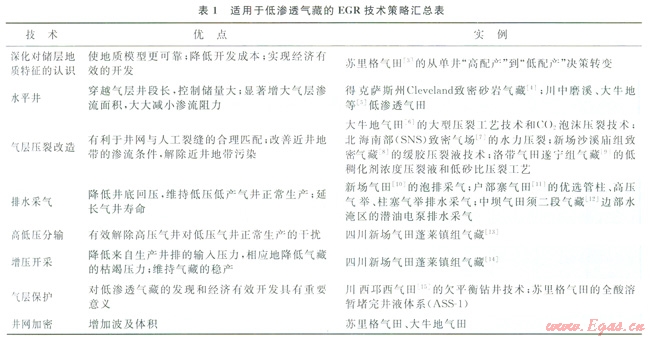 針對低滲透氣藏的增產(chǎn)措施已貫穿于從地質(zhì)研究、鉆井、完井、氣藏工程等直到氣藏停產(chǎn)的整個過程,其主要作用是增大氣體在儲層段的滲透能力,以增加單井產(chǎn)量、最終采收率,最終提高經(jīng)濟效益。低滲透氣藏的EGR技術(shù)策略總結(jié)如表l所示。