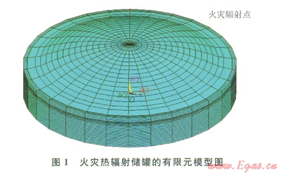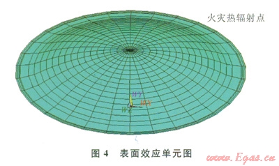 其中承壓環(huán)及襯板用shelll31單元建立、其他部分可用實體單元solid70。有限元模型求解的是連續(xù)體問題,但在此模型中,安全閥的位置離穹頂約16m,是非連續(xù)孤立的節(jié)點。為了能讓安全閥的熱輻射能傳遞到穹頂。必須借助一類特殊的單元即表面效應(yīng)單元,實現(xiàn)孤立火災(zāi)點和儲罐各個部分的熱輻射。
