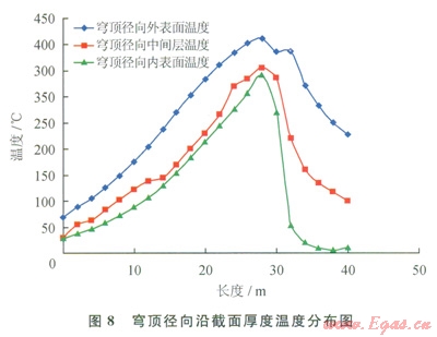 穹頂混凝土的外表面溫度無論是徑向還是環(huán)向,最高溫度均在450℃左右。內(nèi)外表面溫度相差l00℃左右,將產(chǎn)生較大的溫度應(yīng)力(圖8、9)。