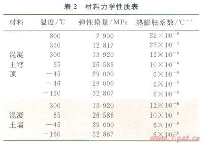 在外界溫度變化下,儲罐內(nèi)的LNG達(dá)到沸點蒸騰,從而產(chǎn)生氣壓。為保護(hù)混凝土外罐免受不斷增加的氣壓作用,需通過穹頂上部的安全閥將超壓的LNG蒸氣排出。在此過程中,LNG蒸氣或被點燃發(fā)生火災(zāi)。在這種偶然工況下,國內(nèi)現(xiàn)有的混凝土規(guī)范尚無規(guī)定,而國外的ENl473等規(guī)范僅給出一般性的條款,沒有具體的計算公式。所以發(fā)生安全閥火災(zāi)時,儲罐各部位的溫度怎么分布?火災(zāi)導(dǎo)致的混凝土熱應(yīng)變是否達(dá)到了極限應(yīng)變等,這些需借助大型有限元軟件進(jìn)行詳細(xì)的熱力學(xué)分析才能得到,指導(dǎo)后續(xù)設(shè)計工作。