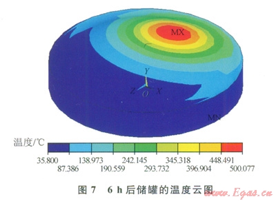 安全閥的熱輻射條件是根據(jù)相關(guān)國外規(guī)范[14],熱輻射能量為32kW/m2,安全閥高度離穹頂約l6m,持火燃燒6h?;馂?zāi)熱輻射是瞬態(tài)熱分析,即熱輻射隨著時間發(fā)生的。為了建立有限元模型的初始條件,在火災(zāi)將要發(fā)生的ls時,執(zhí)行穩(wěn)態(tài)熱分析,得到儲罐的溫度分布情況。然后從1s~6h考慮安全閥火災(zāi)的瞬態(tài)熱輻射,給安全閥孤立節(jié)點施加熱輻射能量,使儲罐獲得相應(yīng)的背景輻射溫度。模型還要考慮通風(fēng)情況下的強(qiáng)制對流,施加根據(jù)努賽爾系數(shù)計算得出的對流換熱系數(shù),并考慮外部環(huán)境溫度的約束條件。