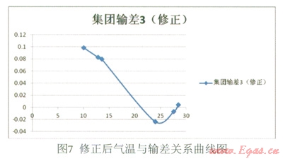 由表l的計算結(jié)果可知,擬合效果很好。因此,可得到回歸方程:y=0.011x3-0.621x2+10.260x-43.096(注:x為氣溫單位℃,y為百分?jǐn)?shù)表示的輸差),其曲線如圖9所示: