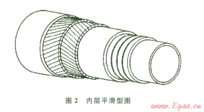 柔性管道主要分為兩種類型:內層平滑型(圖2)和內層褶皺型(圖3)。主要區(qū)別是:前者與介質接觸的最內層材料為塑性管道,而后者最內層材料為金屬互鎖層。內層褶皺型柔性管可以應用于油田和氣田,通球時不會對內壁造成影響,而內層平滑型應用于油田,氣田應用較少,在通球和管線內出現(xiàn)真空工況時,需要避免外力對內壁的破壞。除了最內層的區(qū)別外,其他各層材料及功能都是相似的,