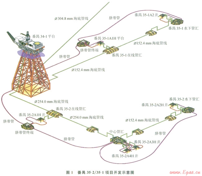 番禺35-2/35-l氣田位于中國南海北部,氣田所在海域水深為l90.2~338.0m。該項目氣田一期計劃開發(fā)6口氣井,采甩半潛式鉆井平臺鉆完井和后期修井與鉆調整井作業(yè),使用水下系統(tǒng)開發(fā)。生產的天然氣用海底管線輸往一個中心平臺后外輸陸地終端[1]。項目開發(fā)示意圖如圖1所示。