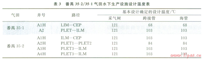 在基本設計過程中,對番禺35-2/35-1水下生產設施設計溫度確認(表3)。在詳細設計中,溫度的調整會導致水下設備(包括各類球閥和閘閥、水下連接器、水下管匯和水下采氣樹)及水下管線(生產管線和跨接管)設計的調整,不但影響項目后期的進度和費用,也會限制生產井的產能,從而不能按照預定配產進行生產。