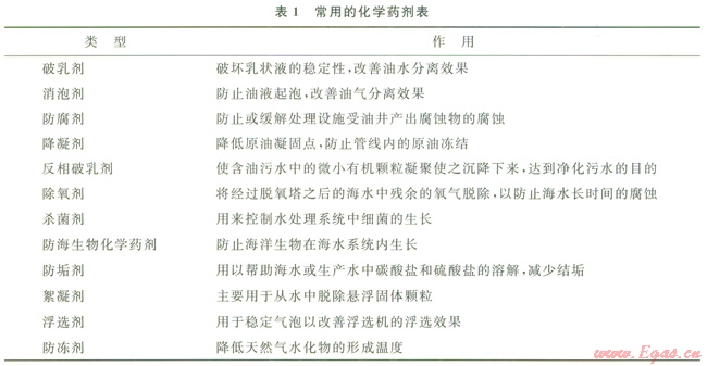 海上油氣田的開發(fā)都離不開化學藥劑,這些藥劑主要用來添加到生產流體、海水等介質中,以此來提高各有關處理設備的處理效率,保護設備與井口管線,以及延長設備的使用壽命等。常用的化學藥劑如表1所示。