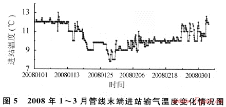 為保證該管線(xiàn)冬季不發(fā)生水合物堵塞,從2007年11月27日開(kāi)始,作業(yè)區(qū)采用緩蝕劑加注泵間歇式加注乙二醇,每間隔2h加注1次,每次加注30min,每天加注50kg左右;該生產(chǎn)期間,平均氣溫為9.37℃,管線(xiàn)末端輸氣溫度在10~12℃。從2008年1月4日開(kāi)始進(jìn)行動(dòng)力學(xué)抑制劑GHI-1現(xiàn)場(chǎng)試驗(yàn),采用連續(xù)式加注,白天(8:00~20:00)泵排量為21%,晚上(20:00~8:00)泵排量為25%,每天藥劑加量控制在13~16kg。此期間平均氣溫降至0~5℃,最低氣溫達(dá)-3℃,管線(xiàn)末端輸氣溫度在8~10℃。生產(chǎn)和試驗(yàn)期間,藥劑加注量如圖3所示,管線(xiàn)輸氣量、首末兩端壓差、輸氣溫度等生產(chǎn)運(yùn)行情況見(jiàn)表2和圖4、5所示。