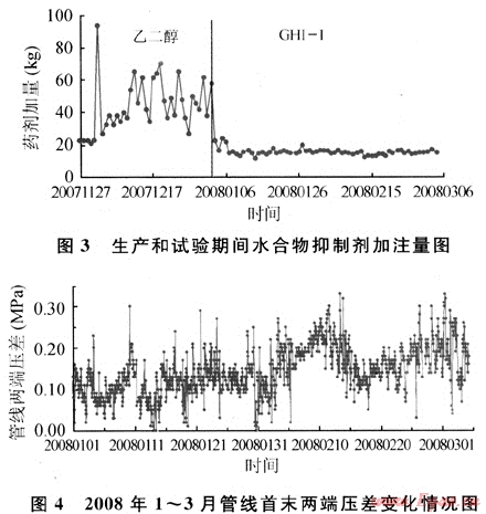 由于該天然氣水合物形成溫度較高(7.0MPa輸壓條件下的水合物形成溫度為18.60℃),投產(chǎn)初期井站節(jié)流閥、分離器等地面設(shè)備、生產(chǎn)管線(xiàn)及下游井站閥門(mén)、分離器、匯管和埋地管線(xiàn)經(jīng)常發(fā)生水合物堵塞現(xiàn)象,特別是在氣溫較低的冬季。每次冰堵后只能采取熱水淋、放空泄壓、清管通球等措施解堵,每3~5d必須清管通球1次,每次清管發(fā)現(xiàn)管內(nèi)有大量固體水合物。為保證該生產(chǎn)管線(xiàn)正常生產(chǎn),從2005年12月21日開(kāi)始,冬季生產(chǎn)過(guò)程中采取加注乙二醇防凍劑,每天間歇式加注45~60kg。