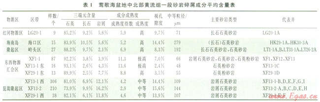 表1顯示,盆地中北部黃流組一段時期總體上以石英砂巖類為主,但不同區(qū)帶的長石、巖屑含量有差異。鶯東斜坡??趨^(qū)、嶺頭區(qū)長石平均含量介于9.7%~10.5%,巖屑平均含量介于2.8%~5.8%,以長石石英砂巖為主,反映以花崗巖為主的海南隆起區(qū)物源性質(zhì);西北部的LG20-1構(gòu)造,其石英、長石、巖屑含量與鶯東斜坡???、嶺頭區(qū)相近,仍以長石石英砂巖為主,但其粒度偏細(平均粒度中值為71mm),為極細砂,反映離物源區(qū)較遠,從其地理位置來看應(yīng)屬紅河物源體系;XFl3-2氣田、XFl3-1氣田西部、XF29-1構(gòu)造西部則以巖屑石英砂巖較為多見,巖屑平均含量介于11.8%~l6.2%(主要為片巖、千枚巖、變質(zhì)砂巖),中等成分成熟度,反映西部昆嵩隆起區(qū)含較多變質(zhì)巖類物源特征;而XFl、XFl2、XFl3、XFl3-1C、XF29-1D井砂巖,粒度細(粒度中值介于48~66mm),長石、巖屑含量低,平均含量分別為2.5%~3.8%、3.9%~7.7%,石英含量極高(大于90%),多為石英粉砂巖,成熟度指數(shù)介于8.8~13.6,屬高極高成分成熟度,反映這些井區(qū)沉積物經(jīng)過較長距離的搬運。