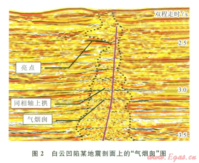 底辟構(gòu)造由地球深部物質(zhì)上拱或刺穿到淺部產(chǎn)生。在含油氣盆地中,流體底辟構(gòu)造是烴源巖垂向幕式排烴和油氣幕式成藏的一種特殊類型。在白云凹陷的地震剖面上發(fā)現(xiàn)了多個(gè)流體底辟帶,底辟的頂部到達(dá)淺部地層,最高處接近海底。流體底辟作用產(chǎn)生的“氣煙囪”呈直立、上小下大的煙囪狀,局部橫向擴(kuò)張呈囊狀、花狀,地震反射同相軸被明顯中斷,自身內(nèi)部反射較雜亂、模糊,甚至為空白反射(模糊帶),局部見同相軸上拱或下拉現(xiàn)象(圖2)。