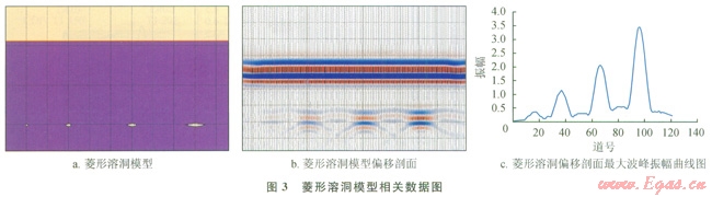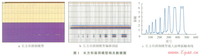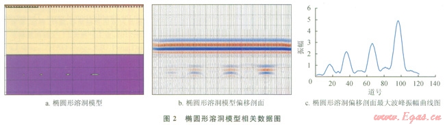 圖2-b是橢圓形溶洞偏移剖面,圖2-c為橢圓形溶洞最大波峰振幅曲線圖;圖3-b、圖3-c分別是菱形溶洞偏移剖面及最大波峰振幅曲線圖??梢钥吹?,無(wú)論是橢圓形模型還是菱形模型,隨著溶洞橫向尺度的增加最大波峰振幅是增加的,這和長(zhǎng)方形溶洞正演模擬結(jié)果很相似。