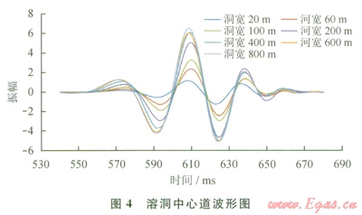 以長(zhǎng)方形溶洞模型為例,提取偏移數(shù)據(jù)溶洞響應(yīng)中心道,其波形圖如圖4所示。由圖4可見:各個(gè)地震道除振幅強(qiáng)弱不同外,其波形特征大致相同,為兩強(qiáng)谷夾一強(qiáng)峰且峰強(qiáng)于谷的特征;各道波形時(shí)長(zhǎng)大致相同,這說明溶洞地震響應(yīng)時(shí)長(zhǎng)與溶洞寬度沒有必然聯(lián)系;振幅雖然隨著溶洞橫向尺度的增大而增大,但是增大的幅度是在不斷減小的,尤其當(dāng)溶洞寬度大于200m后,溶洞對(duì)應(yīng)的最大波峰振幅的增加近乎停止。