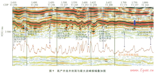 圖9為某區(qū)塊連井剖面與其儲(chǔ)層段最大波峰振幅曲線疊合圖。由圖9可見,這些井除井2、井6外,都設(shè)計(jì)在“串珠”或“羊排”這些具有溶洞反射特征的位置上,同時(shí)它們都對(duì)應(yīng)著最大波峰振幅曲線的極大值點(diǎn),且井l、井3、井4、井5和井7都有鉆具放空、鉆井液漏失等表征溶洞發(fā)育的證據(jù),而井2位于兩“串珠”之間,井6未在“串珠”上,這兩口井均無(wú)放空漏失現(xiàn)象,即是無(wú)溶洞發(fā)育,可見振幅曲線出現(xiàn)極值是溶洞反射特征之一,但并不是所有極值都意味著溶洞發(fā)育。隨著這些井對(duì)應(yīng)振幅的減小,其產(chǎn)量總的來(lái)說是減小的,而產(chǎn)量作為一種衡量溶洞大小及發(fā)育程度的指標(biāo),可見反射振幅越大的溶洞,其尺寸越大,發(fā)育程度越高,這與前面的結(jié)論是相符合的。所以通過這種手段識(shí)別溶洞,可指導(dǎo)實(shí)際生產(chǎn),提高鉆探成功率。