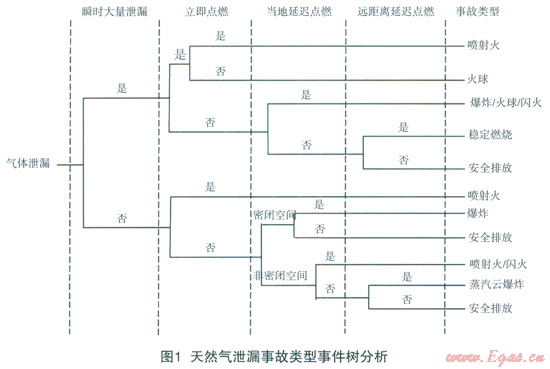 通過(guò)對(duì)近200例國(guó)內(nèi)外燃?xì)夤艿佬孤?、火?zāi)爆炸事故案例的統(tǒng)計(jì)分析,由于第三方破壞、腐蝕等原因會(huì)發(fā)生泄漏、穿孔、破裂等失效模式后,當(dāng)遇到點(diǎn)火源時(shí)通常會(huì)發(fā)生噴射火、火球、閃火、蒸氣云爆炸等危害模式。燃?xì)庑孤┦鹿暑?lèi)型事件樹(shù)分析見(jiàn)圖l。當(dāng)管道遭到破壞發(fā)生瞬時(shí)大量泄漏時(shí),如果立即被點(diǎn)燃,在燃?xì)馀c空氣混合均勻的情況下會(huì)發(fā)生噴射火事故;燃?xì)馀c空氣混合不均勻時(shí)則會(huì)發(fā)生火球事故;如果大量泄漏的燃?xì)馕幢涣⒓袋c(diǎn)燃,而是在當(dāng)?shù)財(cái)U(kuò)散形成氣云后被點(diǎn)燃,則會(huì)發(fā)生爆炸、火球或閃火等事故。當(dāng)泄漏天然氣擴(kuò)散至密閉空間或受限空間后,遇到點(diǎn)火源則會(huì)發(fā)生爆炸事故,這種發(fā)生在限制空間內(nèi)的爆炸破壞性較強(qiáng),往往導(dǎo)致建筑物倒塌,從而可能產(chǎn)生較大的人員傷亡。天然氣泄漏形成可燃?xì)庠票ā⑷紵a(chǎn)生的爆炸沖擊波以及大量熱輻射形成的熱傷害會(huì)對(duì)人員生命財(cái)產(chǎn)安全產(chǎn)生重大威脅,其形成爆炸火球或爆炸沖擊波影響范圍和程度由天然氣泄漏速率、暴露時(shí)間、環(huán)境條件以及點(diǎn)火能量等參數(shù)所決定。