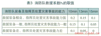 消防隊(duì)對(duì)燃?xì)馐鹿实慕禐?zāi)作用,表現(xiàn)為消防隊(duì)的反應(yīng)時(shí)間和消防隊(duì)的裝備及指揮人員的對(duì)災(zāi)害事故的處置能力兩個(gè)方面。結(jié)合我國(guó)消防隊(duì)到達(dá)現(xiàn)場(chǎng)所用的一般時(shí)間標(biāo)準(zhǔn)以及消防救援裝備和指揮能力評(píng)判,消防隊(duì)救援系數(shù)hf的取值見(jiàn)表3。