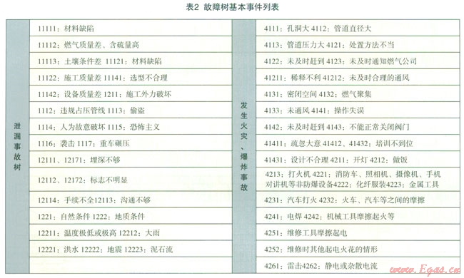 針對(duì)城市中高壓燃?xì)夤艿佬孤?、火?zāi)爆炸災(zāi)害事故,利用故障樹(shù)方法可對(duì)災(zāi)害事故場(chǎng)景各階段的發(fā)生原岡進(jìn)行分析,圖8為泄漏故障樹(shù),圖9為發(fā)生爆炸、火災(zāi)事故故障樹(shù)。將故障樹(shù)中基本事件列入表2。為了更為簡(jiǎn)潔的繪制故障樹(shù),用“代碼”來(lái)表述各影響因素, “代碼”與頂上事件相對(duì)應(yīng)。