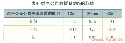 通過(guò)對(duì)所統(tǒng)計(jì)的城市中高壓燃?xì)夤艿朗鹿手腥細(xì)夤咎幹们闆r進(jìn)行分析可知,燃?xì)夤緦?duì)燃?xì)馐鹿实慕禐?zāi)作用,表現(xiàn)為燃?xì)夤镜姆磻?yīng)時(shí)間和燃?xì)夤緦?duì)災(zāi)害事故的處置能力兩個(gè)方面。表示燃?xì)夤揪仍禂?shù)的取值見(jiàn)表4。