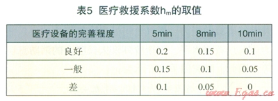 醫(yī)療機(jī)構(gòu)對(duì)燃?xì)馐鹿实慕禐?zāi)作用,表現(xiàn)為醫(yī)療機(jī)構(gòu)到達(dá)現(xiàn)場(chǎng)的急救反應(yīng)時(shí)間和醫(yī)療設(shè)備的完善程度兩個(gè)方面。根據(jù)急救時(shí)對(duì)傷者的救治效果,表示醫(yī)療救援系數(shù)的取值見(jiàn)表5。
