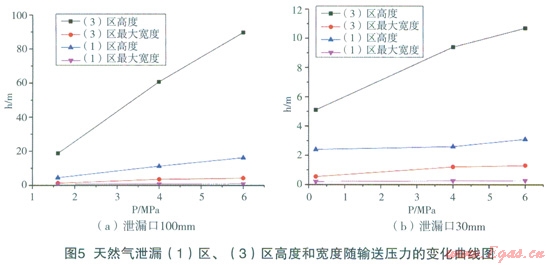 DN900在運(yùn)行壓力6.0MPa,輸氣能力為74.3萬(wàn)m3/h的高壓天然氣輸送管道(管壁厚度l0mm),埋地深度1.2m,泄漏點(diǎn)孔徑30mm時(shí),天然氣泄漏口速度較大,屬超聲速天然氣氣流在空氣中的射流擴(kuò)散,因此,在高度方向的擴(kuò)散遠(yuǎn)大于在水平方面的擴(kuò)散。如圖4所示,在泄漏5s時(shí),天然氣高度已達(dá)150m;25s天然氣已擴(kuò)散至大于250m的高空;50s其在250m下的空間擴(kuò)散形狀趨于定常,即形狀隨時(shí)間推移基本一致。圖5給出了泄漏口l00mm、30mm條件下天然氣泄漏(1)區(qū)、(3)高度和寬度隨輸送壓力的變化曲線圖。從模擬計(jì)算結(jié)果可以看出,隨著輸送壓力的增大,在相同泄漏口條件下,泄漏天然氣流量增大,導(dǎo)致(1)區(qū)、(3)高度和寬度增大。圖6給出了天然氣泄漏(1)區(qū)、(3)高度和寬度隨泄漏口直徑的變化趨勢(shì)圖,圖中表明:在相同輸送壓力下,泄漏口直徑增大,相當(dāng)于泄漏天然氣流量增大,導(dǎo)致(1)區(qū)、(3)高度和寬度增大。