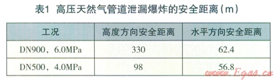 考慮到風(fēng)速以及環(huán)境條件對(duì)天然氣泄漏擴(kuò)散的影響,高度方向保守安全系數(shù)為2,水平方向保守安全系數(shù)取為4,則高壓天然氣管道泄漏爆炸的最小安全距離如表l所示。而在天然氣泄漏點(diǎn)源的常年風(fēng)向下風(fēng)向位置,水平方向的安全距離則應(yīng)適當(dāng)增大。