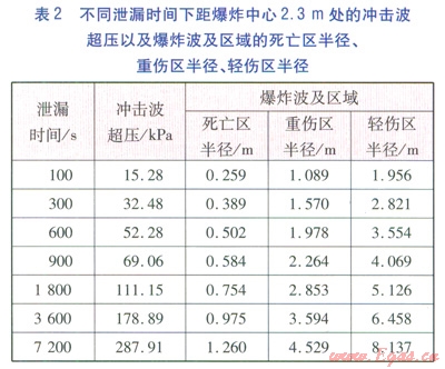 由表2~4可知,在距爆炸中心2.3m處:當泄漏時間為300s時,爆炸導致墻體出現(xiàn)裂縫,人員輕微受傷;當泄漏時間為600s時,爆炸導致墻體出現(xiàn)較大裂縫,人員內(nèi)臟嚴重損傷或死亡;當泄漏時間為900s時,爆炸導致木結構建筑立柱折斷,使得人員內(nèi)臟嚴重損傷或死亡;當泄漏時間為7200s時,爆炸導致大型鋼架結構破壞,大部分人員死亡。
