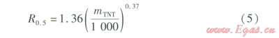 式中R0.5——人員因沖擊波作用導致肺出血而死亡的概率為0.5的破壞半徑,m