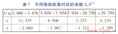 不同等效距離對應的系數(shù)a、b見表l[5]。