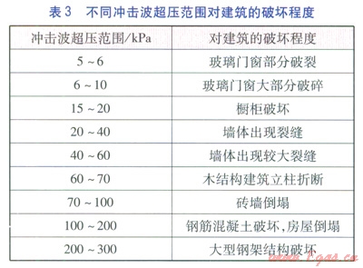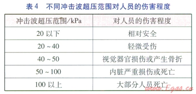 不同沖擊波超壓范圍對建筑物的破壞程度、對人體傷害程度分別見表3、4[5]。