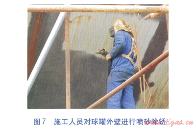為保證球罐外壁的防腐質(zhì)量,要求對(duì)球罐外壁進(jìn)行噴砂除銹處理,除銹等級(jí)達(dá)到Sa2.5級(jí)(非常徹底的噴射或拋射除銹)。施工人員對(duì)球罐外壁進(jìn)行噴砂除銹、噴涂防腐油漆分別見(jiàn)圖7、8。