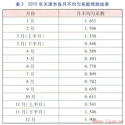 2015年天津市各類用戶天然氣用量預(yù)測結(jié)果見表2。由表2可知,2015年最大用氣量將達到164.02×108m3,并作為計算2015年季節(jié)調(diào)峰儲氣量的基礎(chǔ)數(shù)據(jù)。2015年天津市各月不均勻系數(shù)預(yù)測結(jié)果見表3,由于3月15日、ll月15日分別為供暖期結(jié)束和供暖期開始時間,因此這兩個月的上下半月不均勻系數(shù)變化較大。
