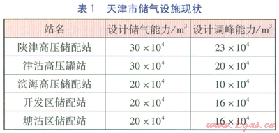 天津市儲氣設(shè)施現(xiàn)狀見表1。目前,天津市冬季平均日用氣量已突破570×104m3/d,由表1可知,現(xiàn)有儲氣設(shè)施設(shè)計調(diào)峰能力約85×104m3,只能基本滿足小時調(diào)峰。由中石油建設(shè)的大張坨氣藏地下儲氣庫,總庫容達30×108m3,設(shè)計調(diào)峰能力約14×108m3,主要為北京進行調(diào)峰,其次為天津,但實際上無法滿足天津的調(diào)峰需求。隨著天津市天然氣用氣規(guī)模的擴大,用氣量的季節(jié)性差異也逐步增大,僅依靠上述儲氣設(shè)施遠不能滿足季節(jié)調(diào)峰需求。因此,現(xiàn)階段天津市的季節(jié)調(diào)峰只能依靠上游氣源并控制一些工業(yè)用戶的生產(chǎn)周期進行調(diào)節(jié)。