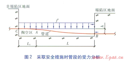 當塌陷區(qū)接近或達到允許沉降量時,點A處的管道將出現(xiàn)失穩(wěn),必須采取安全措施降低當量應力。安全措施的具體方法為:將管段AB上方的覆土挖走,將土壤荷載卸載。再從點A向塌陷斷裂帶非塌陷區(qū)一側開挖一段距離到達點C,并將管段翻下部掏空,以緩解管段AB的彎曲變形,以便較好地應對下一次沉降,將管段下部懸空部分填實后回填至沉降后地面高度。在實際操作中我們關心的是如何確定塌陷斷裂帶非塌陷區(qū)一側開挖長度。采取安全措施時管段的受力分析見圖2。