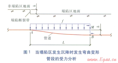 在正常情況下,管道自重(包括供熱介質(zhì)重量)加上部土壤重量等于管道下部土壤的支撐力,無論是有補償管道還是無補償管道,管道不會出現(xiàn)彎曲變形。然而,當塌陷區(qū)發(fā)生沉降時,由于管道的連續(xù)性,塌陷斷裂帶的塌陷區(qū)一側部分管段將發(fā)生彎曲變形(見圖l),并出現(xiàn)懸空現(xiàn)象,使得管道上部出現(xiàn)均布荷載,直至彎曲變形終止。當塌陷區(qū)發(fā)生沉降時發(fā)生彎曲變形管段的受力分析見圖l。