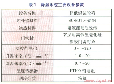 進(jìn)行低溫試驗(yàn)時(shí),爆炸初始溫度低至-170℃,為滿足溫度要求,降溫系統(tǒng)采用超低溫試驗(yàn)箱,液氮冷卻,溫度由智能儀表自動(dòng)控制。降溫系統(tǒng)主要設(shè)備參數(shù)見表1。