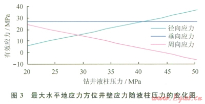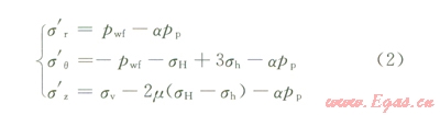 式中s′r、s′q、s′z,分別為井壁徑向、周向、垂向的有效應力;pwf井內液柱壓力;pp為地層壓力;m為巖石泊松比;m為井周角(井壁上某點的失徑與最大水平地應力方位的夾角) sH、sh分別為最大、最小水平地應力。